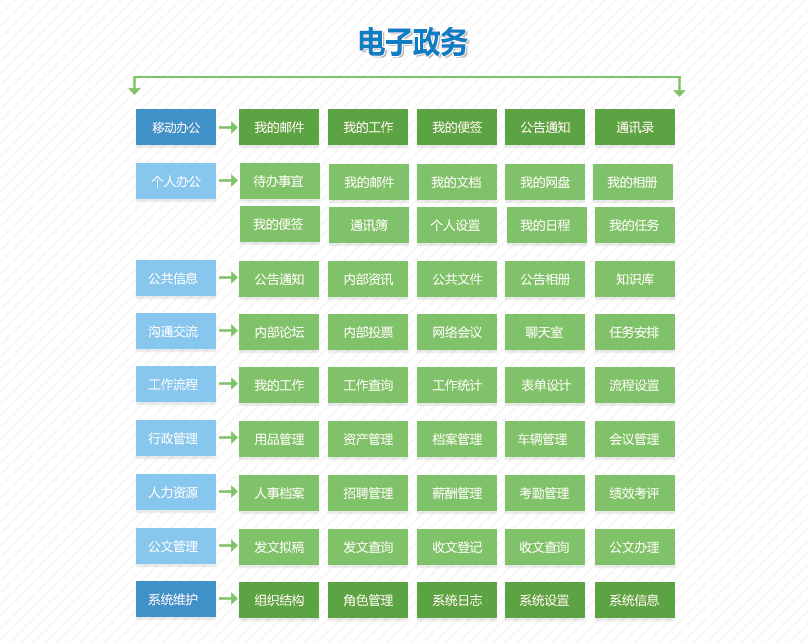 系统包括个人办公、公共信息、沟通交流、工作流程、行政管理、人力资源、公文管理、系统维护和移动办公等9大模块,如下图所示:
